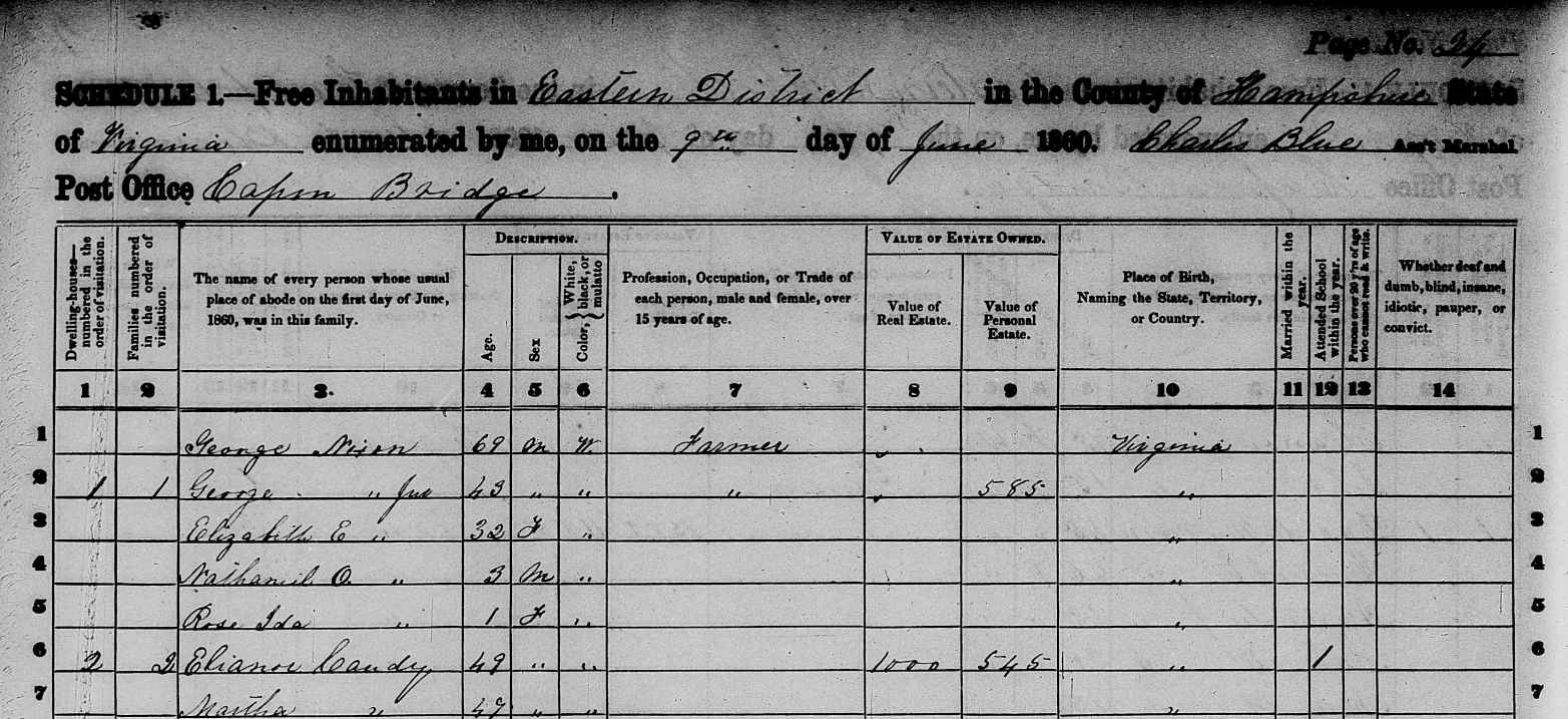 1860 Federal Census; Eastern District, Hampshire County, VA. Household of George Nixon Jr.