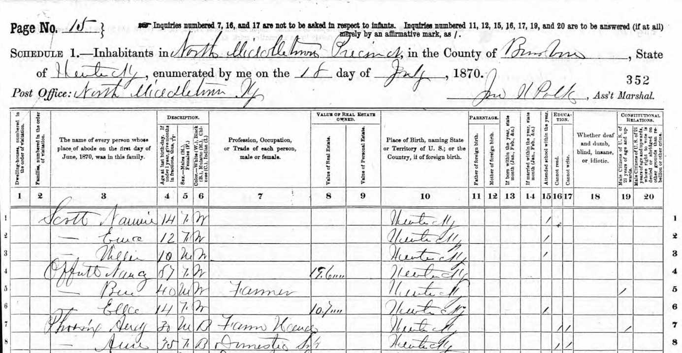1870 Federal Census; North Middleton Precinct, Bourbon County, KY. Household of James Scott continued, page 15