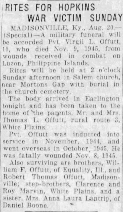 Funeral Notice for Pvt. Virgil L. Offutt