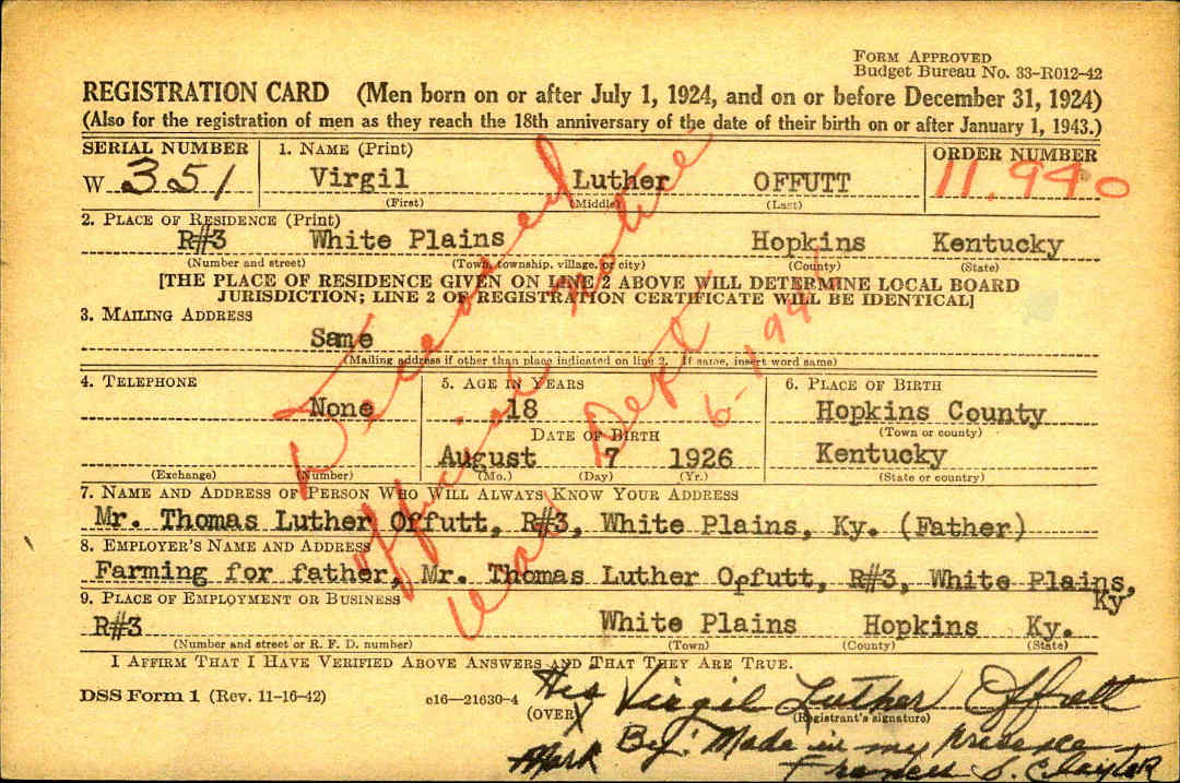 Draft Registration card for Virgil Luther Offutt