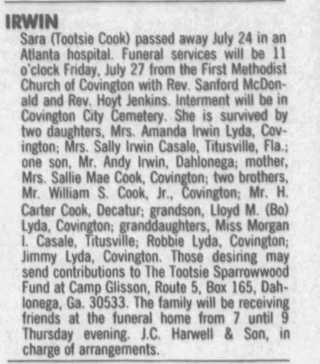Funeral notice for Sara Cook Irwin