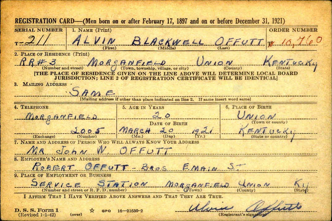 WWII Draft Registration Card for Alvin Blackwell Offutt
