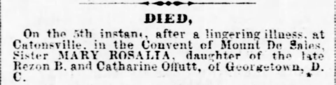 Death of Sister Mary Rosalia, daughter of Rezon B. and Catharine Offutt