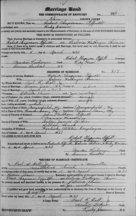 Marriage Record for Robert Chapman Offutt and Belvia Kathryn Chinn