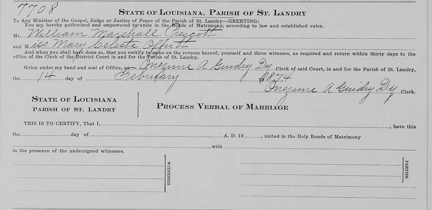 Marriage Record 7708; Marriage of Mary Celeste Offutt and William Marshall Prescott. Only has authorization portion completed