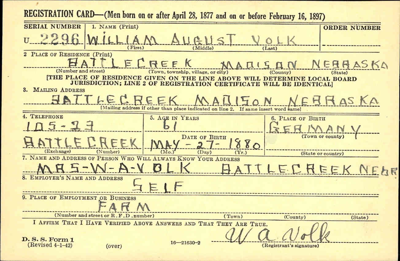 WWII Draft Registration Card for William August Volk