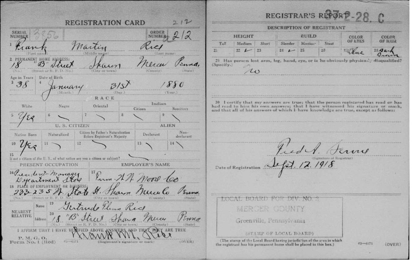 World War I Draft Registration; Frank Martin Rice