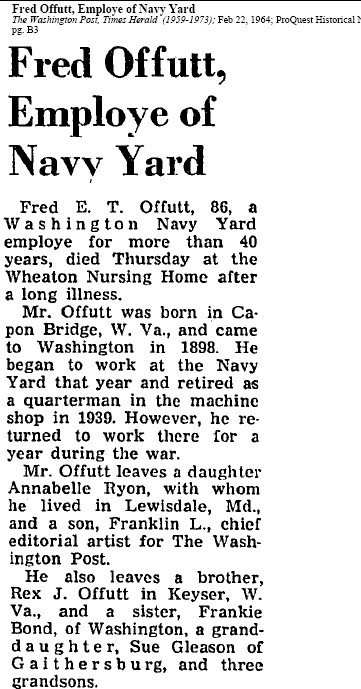 Obituary of Fred E. T. Offutt, published in the February 22, 1964 Washington Post on page B3