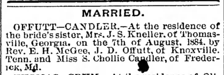 Marriage Announcement for J. D. Offutt and Miss S. Chollie Candler
