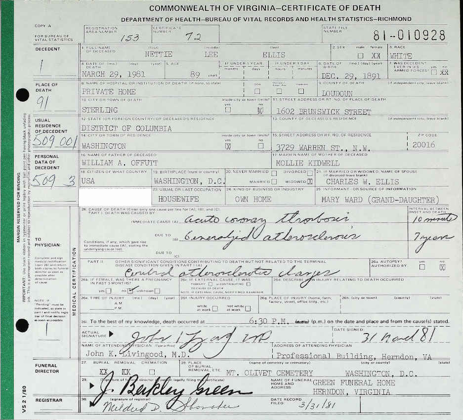 Virginia Death Certificate for Nettie Lee (nee Offutt) Ellis