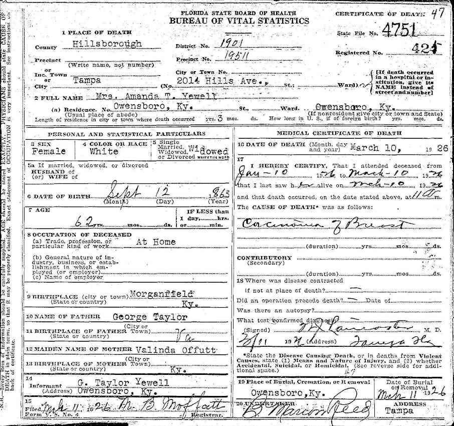 Florida Death Certificate for Mrs. Amanda T. Yewell