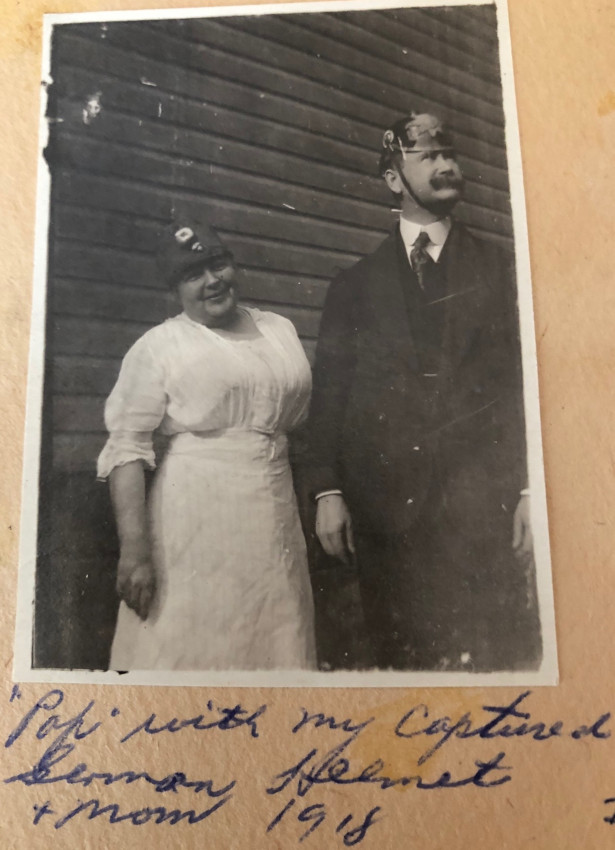 Photo of William M. and wife Annie Offutt. The helmet was a war souvenir brought home by William B. Offutt)