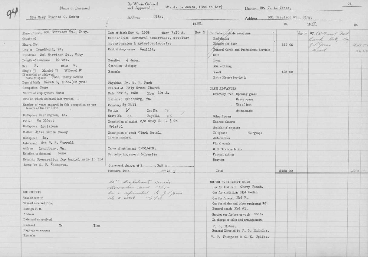 Funeral Home Record for Mary Edmonia O. Cobbs