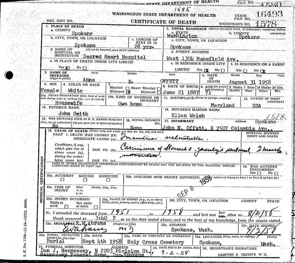 Washington Death Certificate for Anna E. Offutt