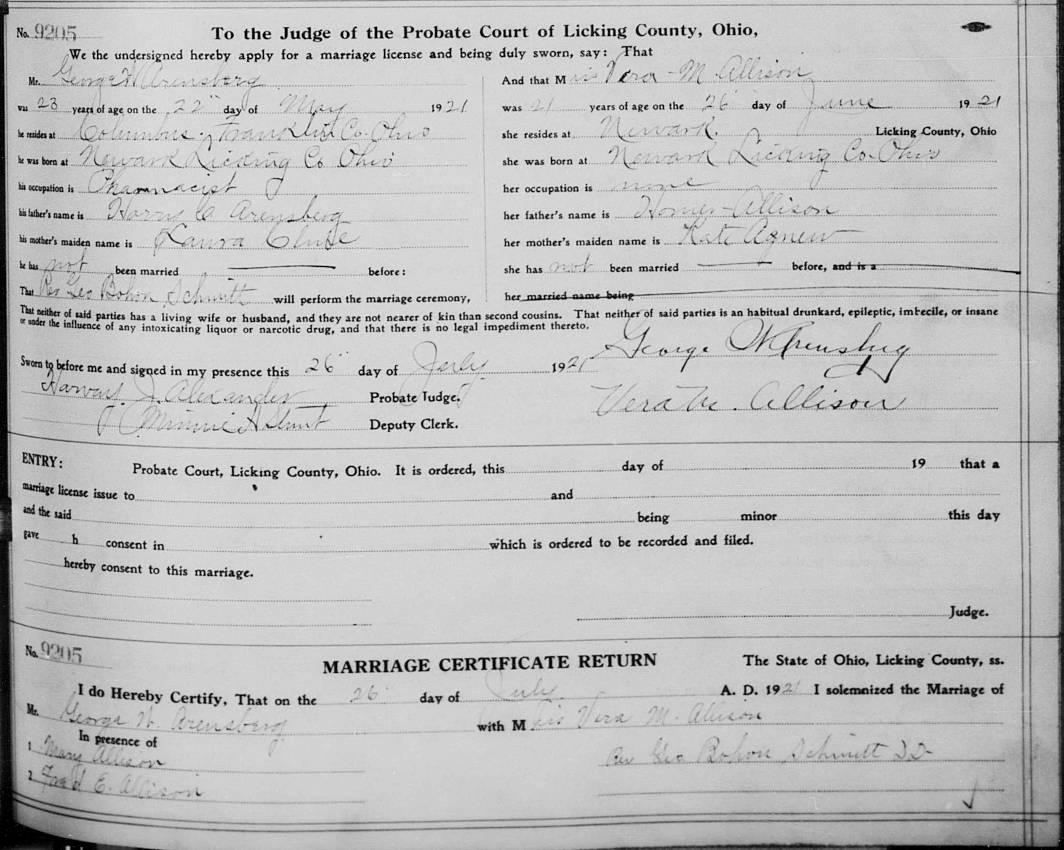 Marriage #9205 found on page 479 between George W. Arensberg & Vera M. Alllison