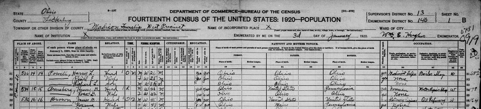 1920 Federal Census for Madison Township, Licking County, Ohio