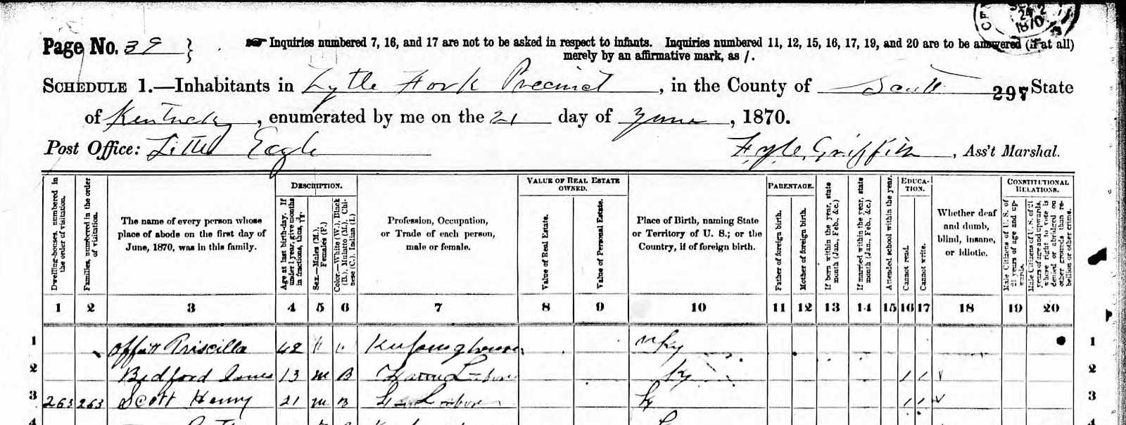 1870 Federal Census; Lytle Fork Precinct, Scott County, KY