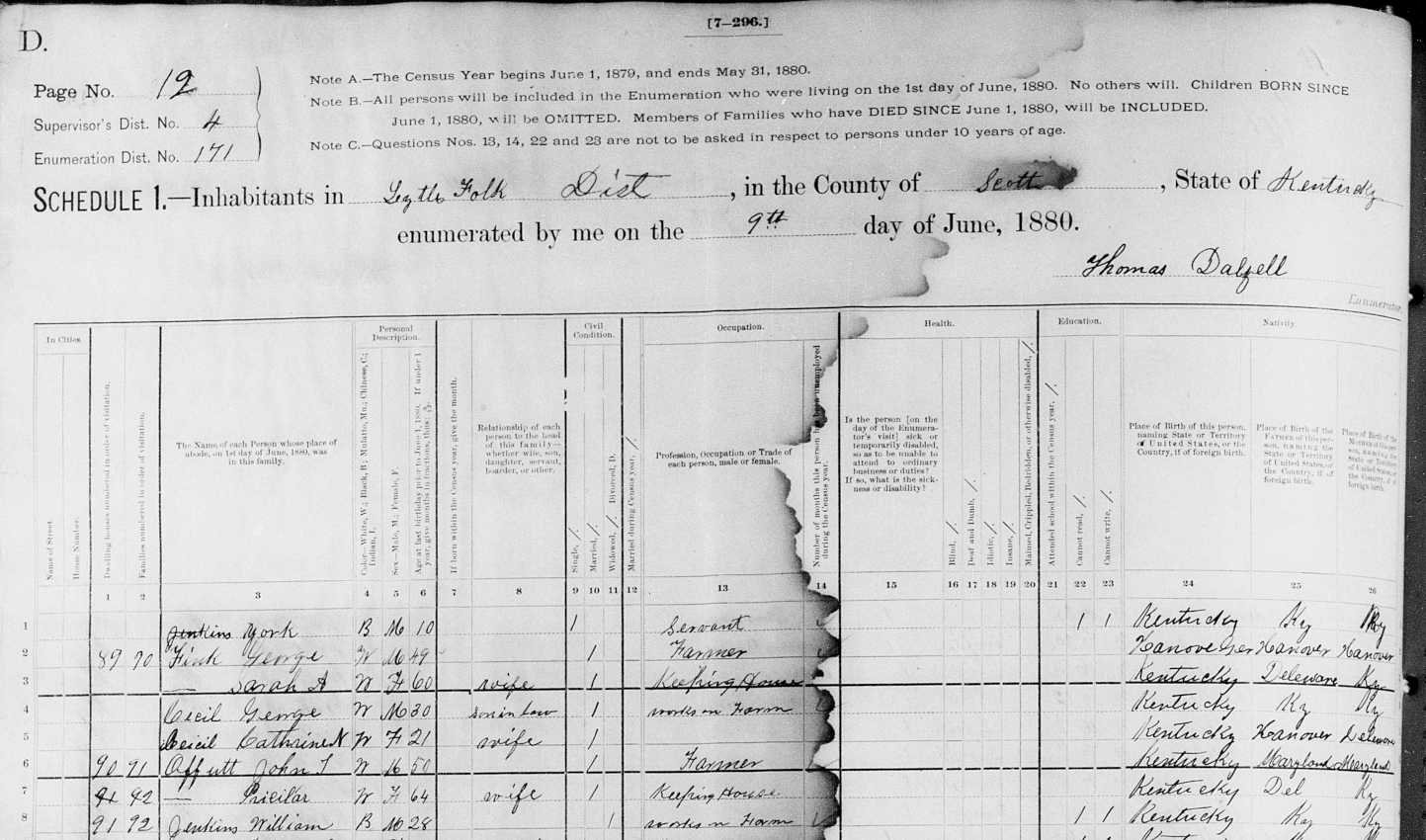 1880 Federal Census of Lytle Fork District, Scott County, KY. Household of John T. Offutt