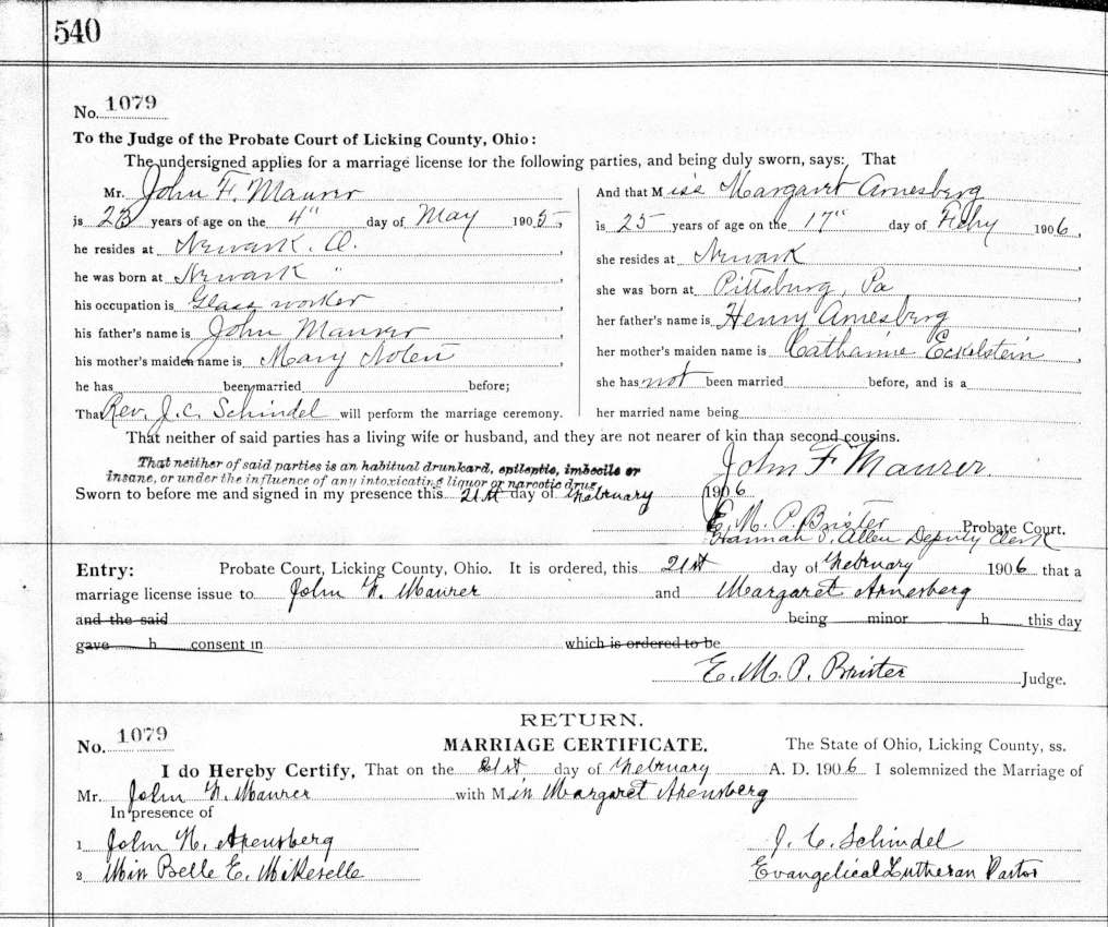 Marriage record for Margaret May Arensberg and John F. Maurer