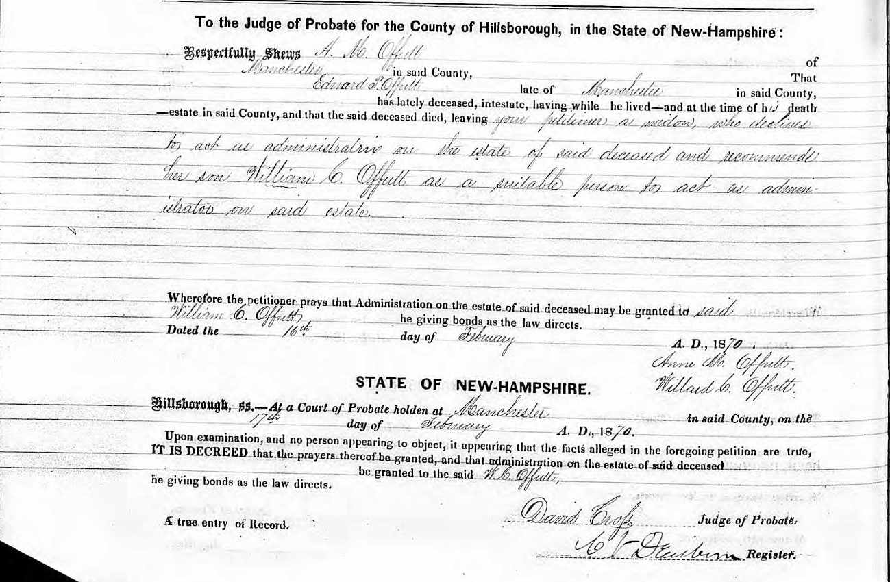 Request by A. M. Offutt to have son William C. Offutt administer the estate of Edward P. Offutt, his father