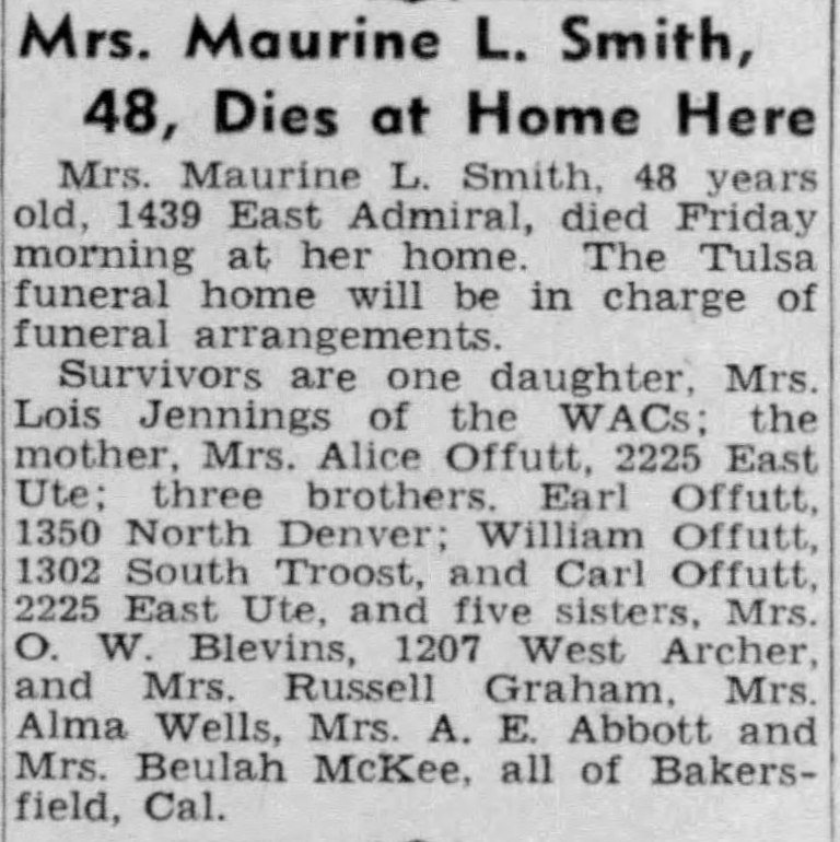 Printed in the Saturday, April 15, 1944 edition of the Tulsa Daily World on page 10