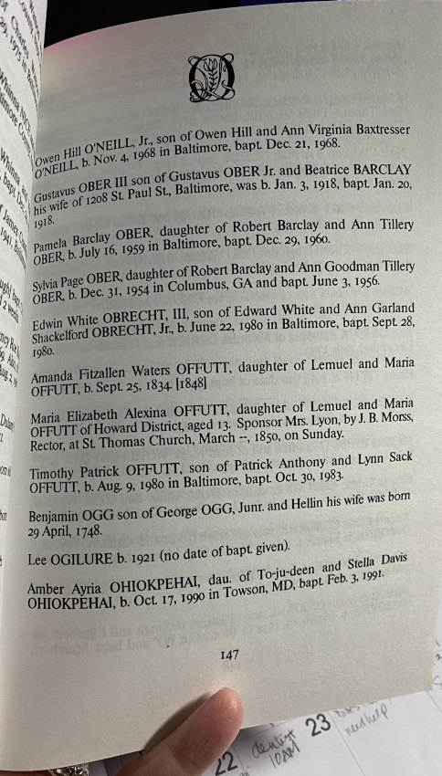 Page 147 of St. Thomas Parish baptisms : Owings Mills, Maryland, 1732-1995 showing the Offutt's listed