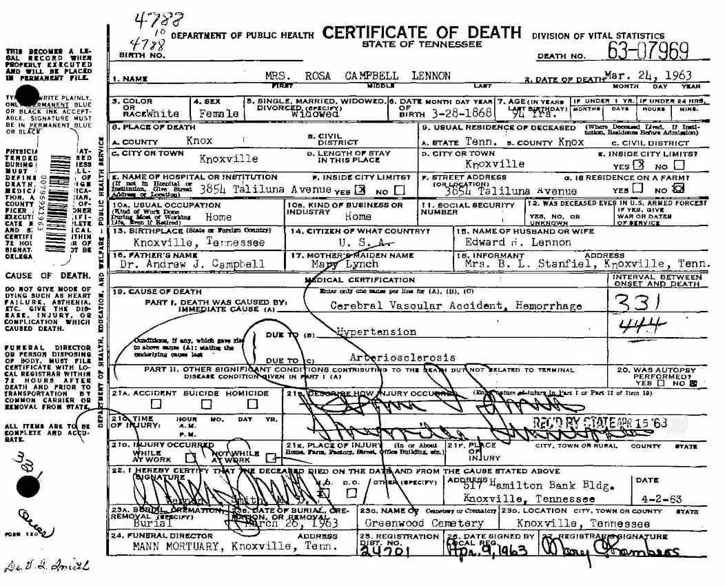 Tennessee Death Certificate for Rosa Campbell Lennon