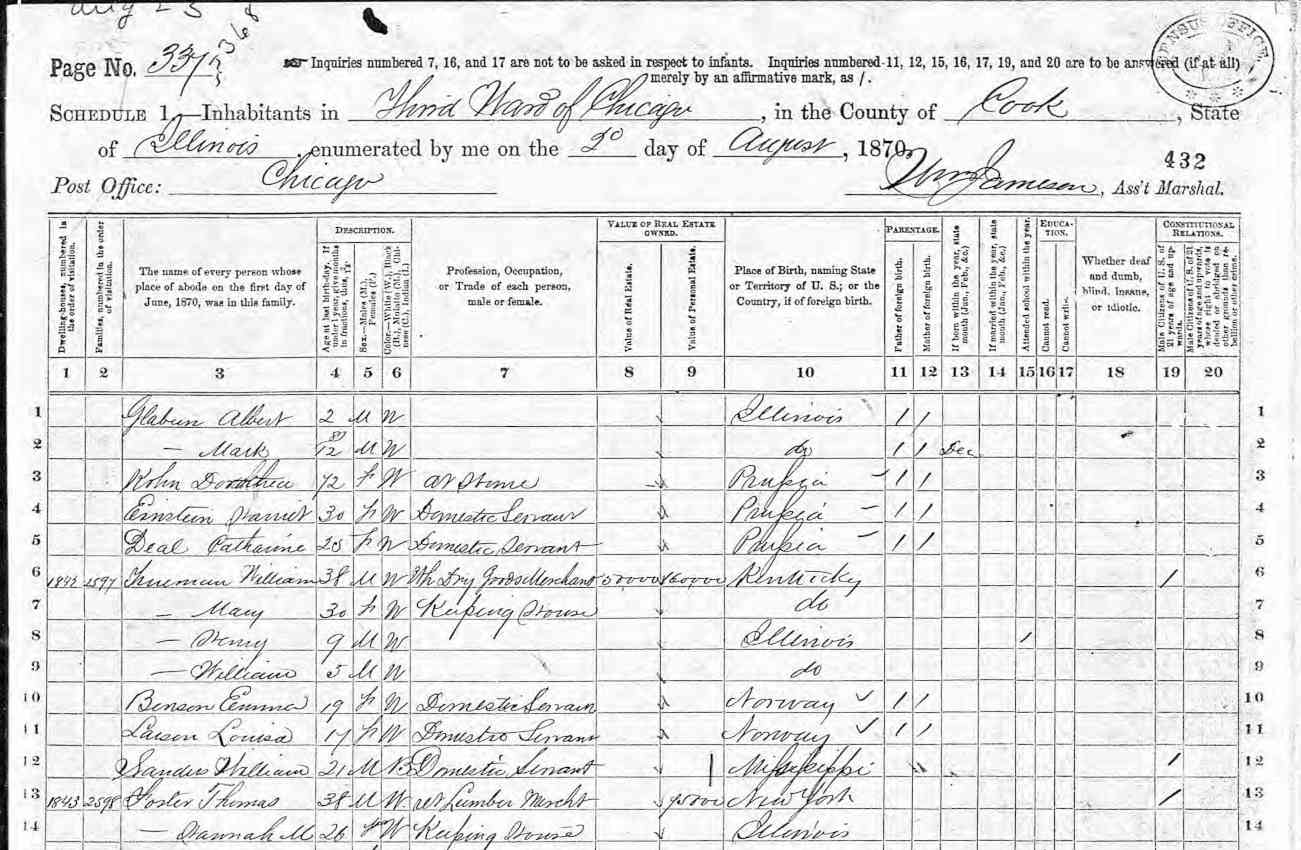 1870 Federal Census of 3rd Ward, Chicago, Cook County, IL. Household of William Tureman