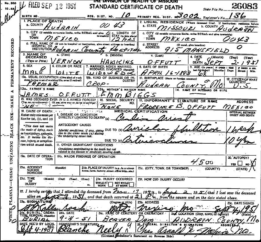Missouri Death Certificate #26083 for Vernon Hawkins Offutt