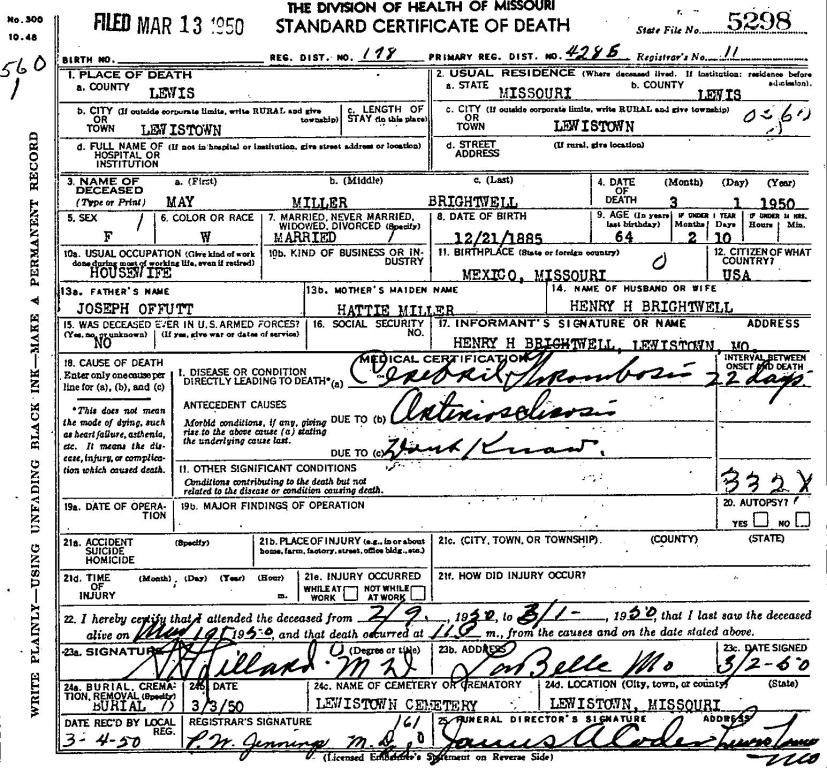 MO Death Certificate # 5298 for May Miller Brightwell