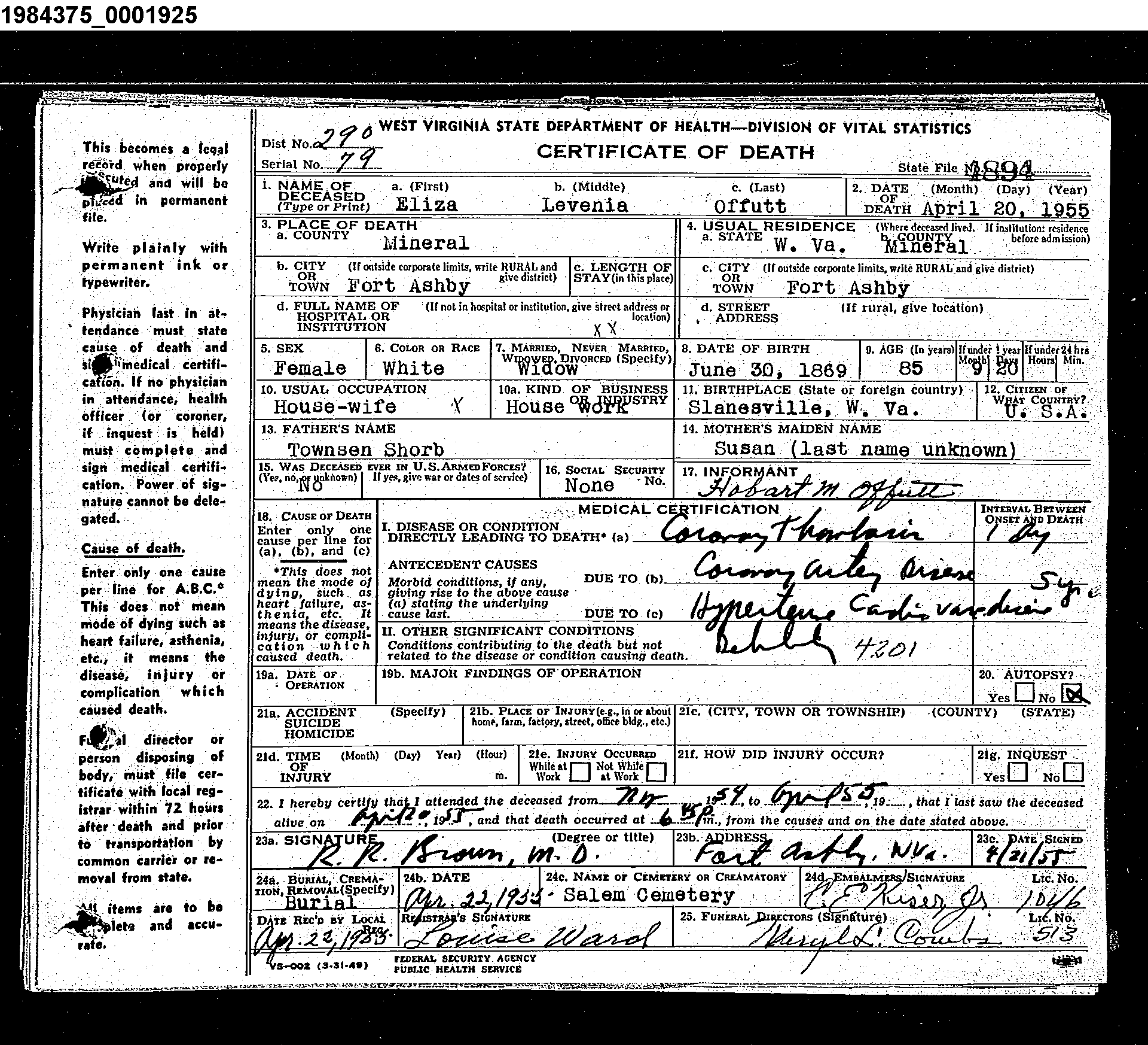 West Virginia Death Certificate for Eliza Levenia Offutt