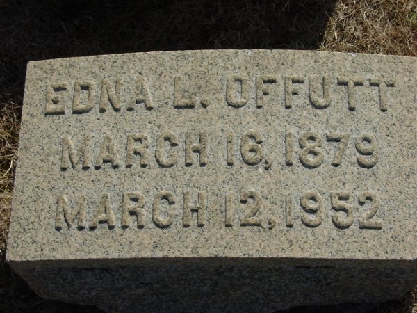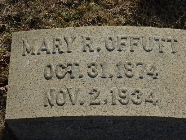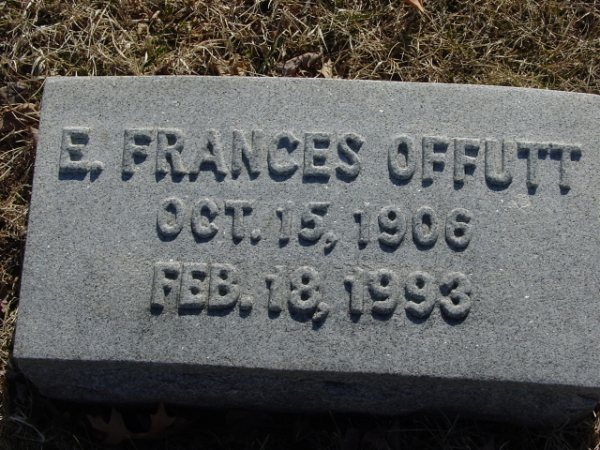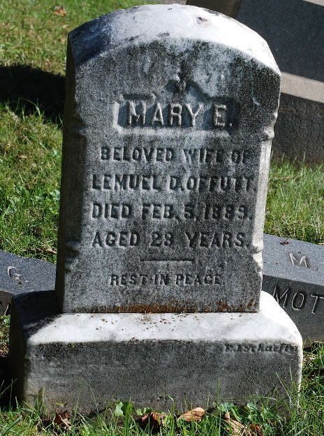 - [S1103] Find A Grave, online http://www.findagrave.com/cgi-bin/fg.cgi, Find A Grave memorial #184010924. Buried in Section A, Lot 151, Grave 6. Photo of grave marker, "MARY E. BELOVED WIFE OF LEMUEL D. OFFUTT DIED FEB. 5, 1889 AGED 28 YEARS REST IN PEACE."