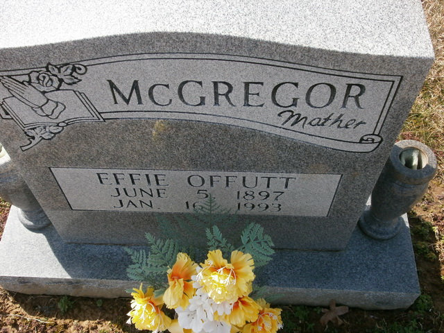- [S1103] Find A Grave, online http://www.findagrave.com/cgi-bin/fg.cgi, Find A Grave memorial #85811565. Photo of grave marker. "McGREGOR Mother EFFIE OFFUTT JUNE 5, 1897 JAN. 16, 1993."