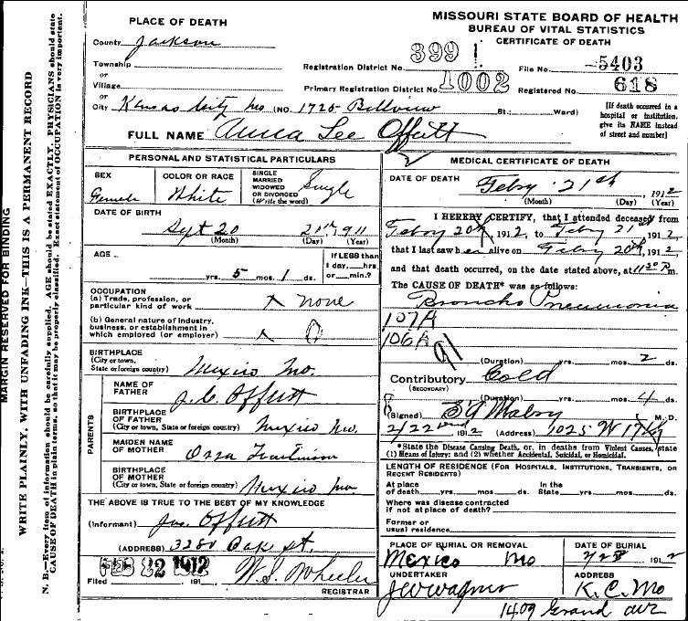 - [S1078] Anna Lee Offutt, MO Death Cert., Date could be 22 Feb 1912. No cemetery given.