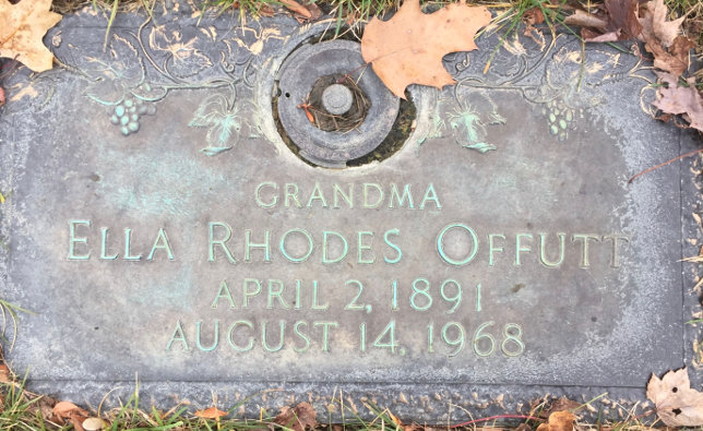 - [S1103] Find A Grave, online http://www.findagrave.com/cgi-bin/fg.cgi, Find A Grave memorial #185187642. Photo of grave marker: Grandma; Ella Rhodes Offutt; April 2, 1891 - August 14, 1968.