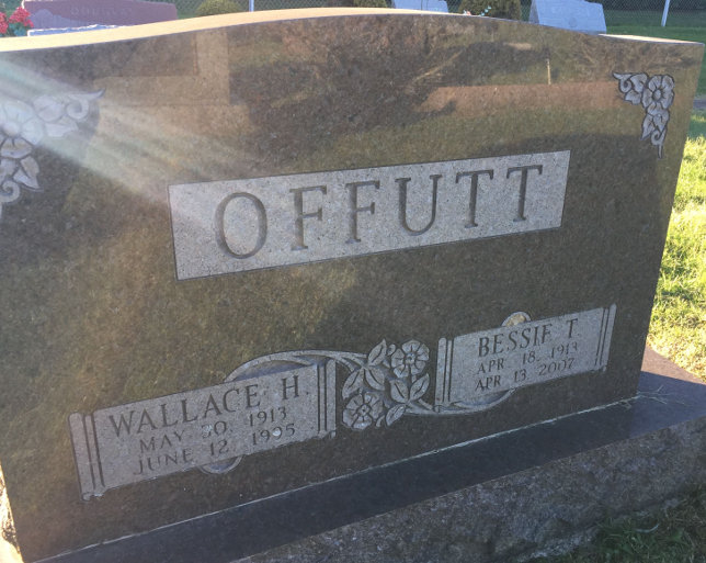 - [S1103] Find A Grave, online http://www.findagrave.com/cgi-bin/fg.cgi, Find A Grave memorial #185187642. Photo of grave marker: Stone shared; Wallace H. Offutt; May 30, 1913 - June 12, 1995. Bessie T. Offutt; April 18, 1913 - April 13, 2007.