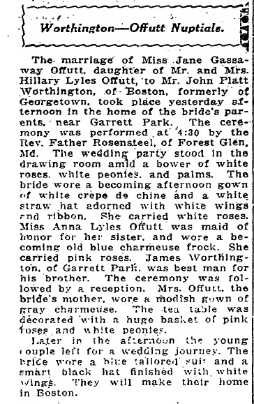 Marriage of Jane Gassaway Offutt and John Platt Worthington