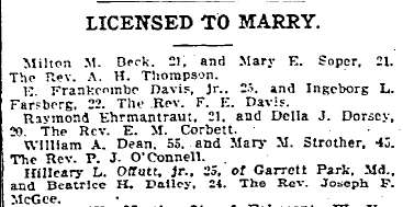 - [S1161] The Washington Post, June 3, 1917, Pg. E8, States that the marriage took place in the brides parent's house near Garrett Park, MD.