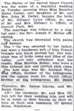 - [S1459] January 20, 1920 Federal Census, 700 Pennsylvania AVE, NW, Washington, DC, USA, Population Schedule; Washington, DC, Household of Hilleary "S." Offutt, Jr. Line 96 lists wife Beatrice (?)., age 30, born in DC.
