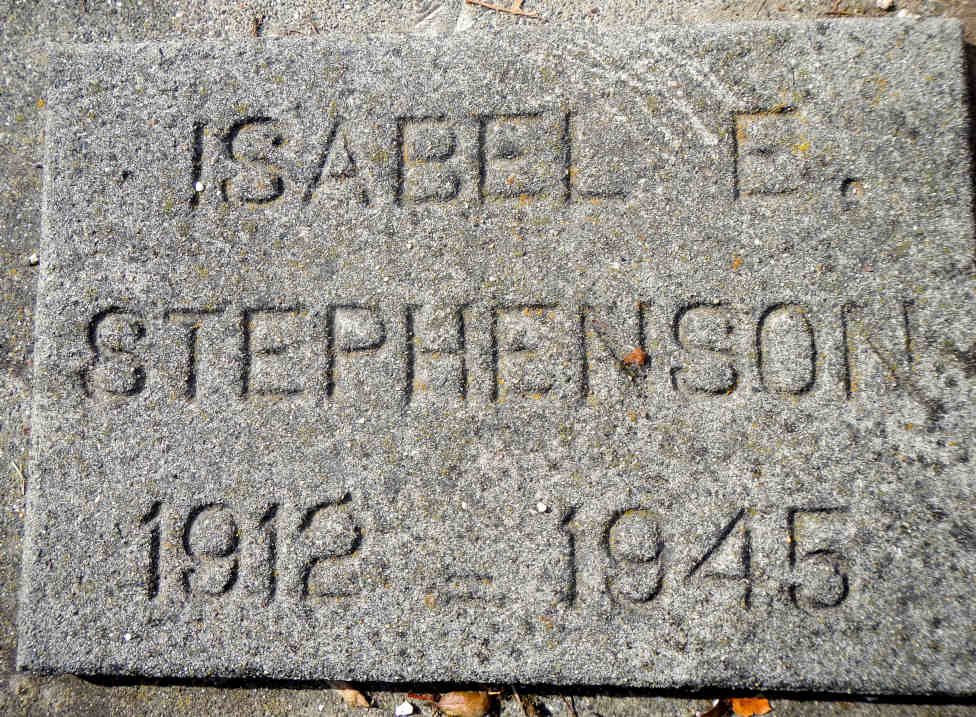 - [S1103] Find A Grave, online http://www.findagrave.com/cgi-bin/fg.cgi, Find A Grave memorial #125116643. Buried in Sec 3, 399-404, 407-417, 422, 442-453. Photo of grave marker. "ISABEL E STEPHENSON 1912 - 1945."