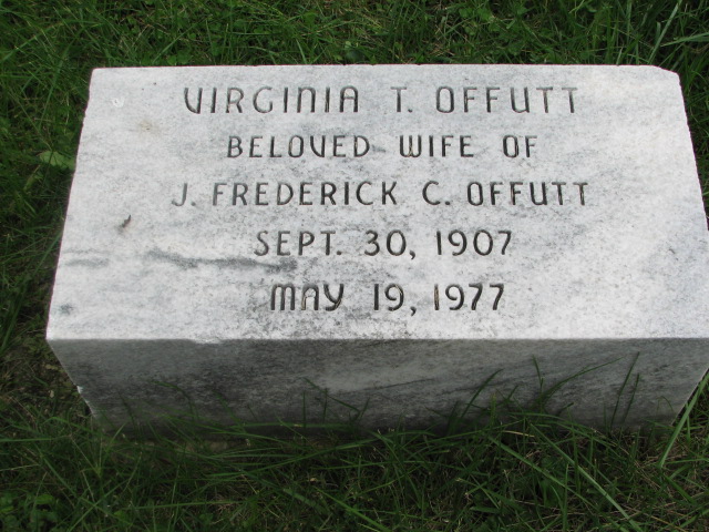 - [S1103] Find A Grave, online http://www.findagrave.com/cgi-bin/fg.cgi, Sherwood Episcopal Church Cemetery, lists information for Virginia T. Offutt, wife of J. Frederick C. Offutt. Provided a picture of the marker.