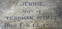 - [S1103] Find A Grave, online http://www.findagrave.com/cgi-bin/fg.cgi, Find a Grave memorial #91596783. Photo of grave marker. "Jennie Wife of Tilghman Offutt Died Feb. 12, 1888. Originally had the date of death as February 12, 1888. I've removed that date based on the notice of funeral dated February 13, 1889, as well as the cemetery records having her burial date as February 13, 1889.