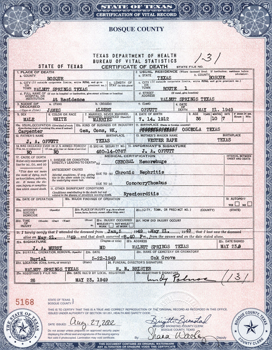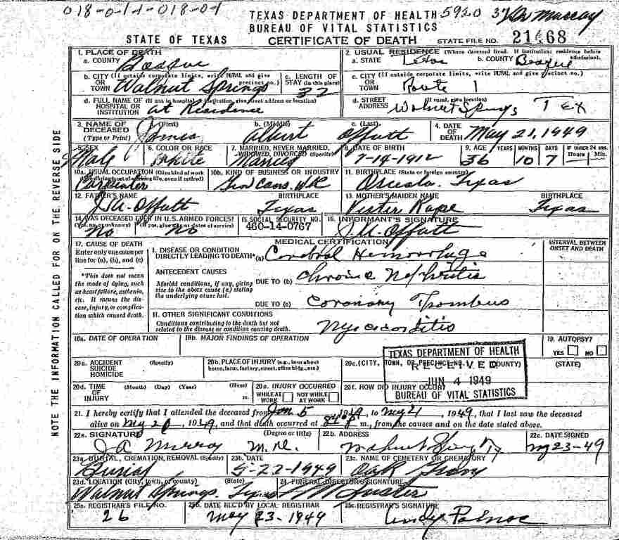 - [S2586] Mamie Doyal Offutt, Texas Birth Certificate Correction Reg. Dist # , Register #, File #35866 (April 25, 1946).