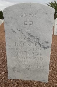 - [S1103] Find A Grave, online http://www.findagrave.com/cgi-bin/fg.cgi, Find A Grave memorial #159554635. Buried in Section GG, Site 536. Photo of grave marker. "MAMIE RACKLEY JUN 10, 1926 - MAR 13, 2016 BELOVED WIFE MOTHER AND GRANDMOTHER". Bio has "Our beloved mother and grandmother Mamie D. Rackley was born on June 10, 1926 in Hedley, Texas and passed away March 13, 2016 in El Paso, Texas. She was a hair dresser and house wife. Preceded in death by her husband; Raymond A. Rackley, parents; Doyal David Offutt and Muriel Offutt, brothers; Olin, Theodore and Arles Offutt. She is survived by daughter Linda Elsey and husband Ed, son; David Rackley and Mary Ann Farmer of Justin Texas, grandsons; David Thompson of McAllen Texas, Darrel Rackley of El Paso Texas, granddaughter; Jeannie and Joe Moncada of El Paso Texas, great-grandchildren; Jacob, Aber and Brianna Moncada, David and Jessica Thompson, Christian Rackley. Pallbearers will be David Thompson, Darrel Rackley, Joe Moncada, Jacob Moncada, Jesse Lawhorn and Jeff Gosc. Our deepest gratitude to Dr. Jerry Miller for his years of care and to CIMA Hospice for their care and support through our sorrow. Visitation will be held on Wednesday, March 16, 2016 from 5:00pm until 9:00pm at Sunset Funeral Home-East, 750 N. Carolina Dr. Funeral Services will be conducted on Thursday, March 17, 2016 at 12:00pm at Eastwood Church of Christ, 10104 Album Ave., El Paso, Texas 79925. Interment to follow at Fort Bliss National Cemetery. Services entrusted to Sunset Funeral Home-East."