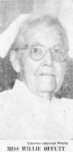 - [S5325] The Courier-Journal, January 10, 1958, Section 2 Pg. 12, Obituary printed in the January 10, 1958 edition of The Courier-Journal, Section 2 page 12. States "Miss Willie Offutt, nurse at American Radiator & Standard Sanitary Corporation for 40 years, died at 11:40 a.m. yesterday at her home, 1253 Cherokee Road. Miss Offutt, 84, was the first industrial nurse in Kentucky. She was graduated from the old City Hospital nursing class in 1906, and did private-duty nursing before going to work at Standard Sanitary in 1913.... She retired 3 years ago. She was a native of Versailles. A sister, Miss Mary Offutt survives. The funeral will be at 2 p.m. tomorrow at Pearson's, 1310 S. Third. Burial will be in Resthaven Memorial Park."