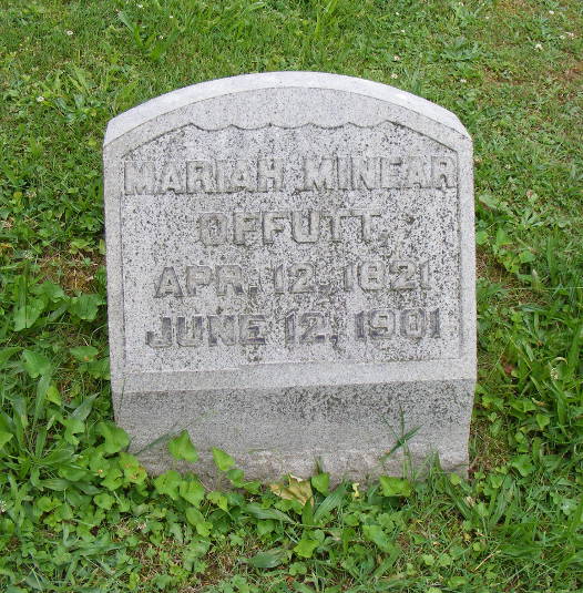 - [S1103] Find A Grave, online http://www.findagrave.com/cgi-bin/fg.cgi, Find A Grave Memorial #147336820 Photo of grave marker showing name as Mariah Minear Offutt.