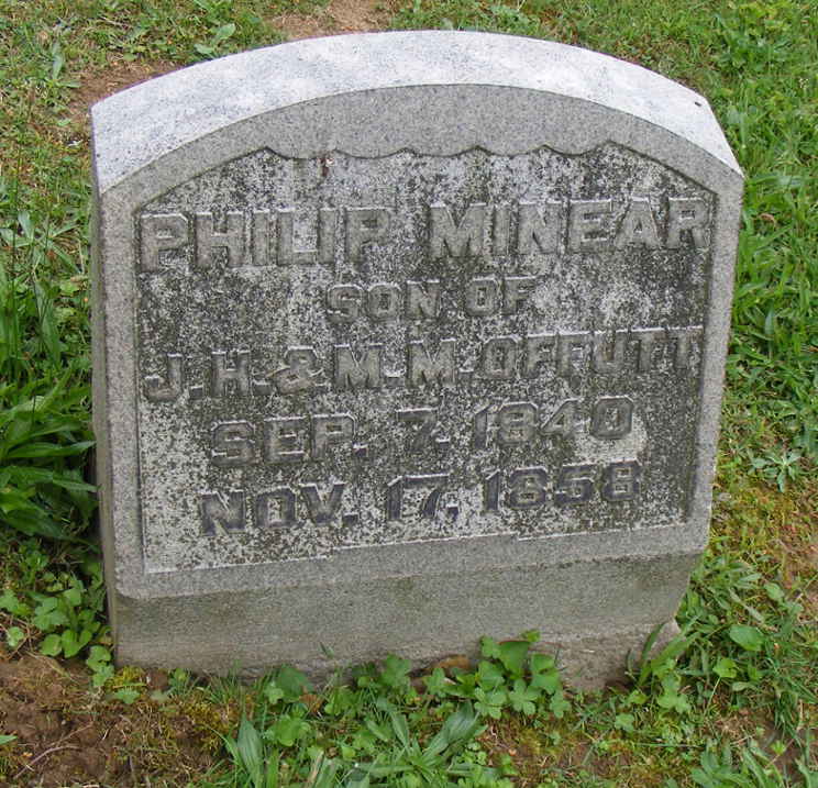 , in the household of Joseph Howard Offutt and Mariah Minear on August 31, 1850.4 Philip M. Offutt died on November 17, 1858 at age 18.5 He was buried after November 17, 1858 at Grandview Cemetery, Chillicothe, Ross County, OH, USA