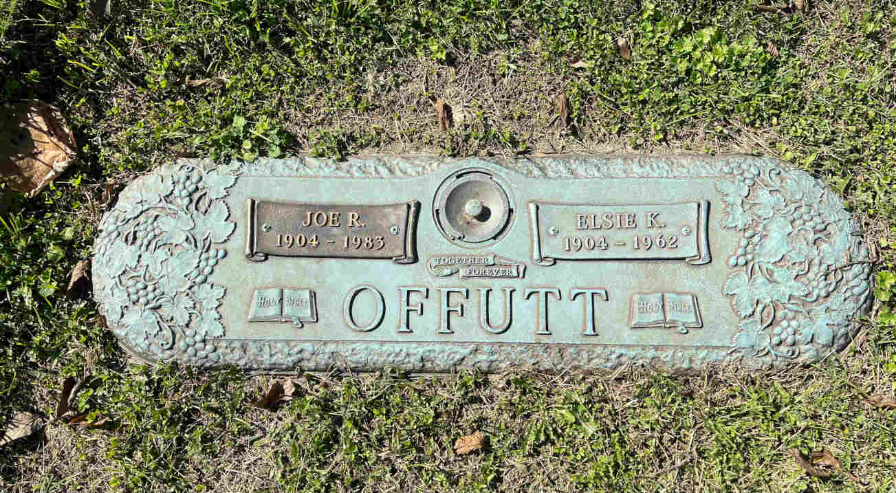 - [S1103] Find A Grave, online http://www.findagrave.com/cgi-bin/fg.cgi, Find A Grave memorial #91311018. Photo of shared grave marker. "JOE R. 1904 - 1983 ELSIE K. 1904 - 1962 OFFUTT TOGETHER FOREVER."