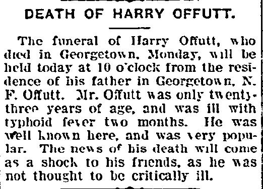 - [S845] Georgetown City Cemetery (KY), online http://www.georgetown-kentucky-cemetery.com/cscemsmain.asp, Lists Harry Offutt, born 6/13/1878 and died 12/28/1903. Buried 12/30/1903.