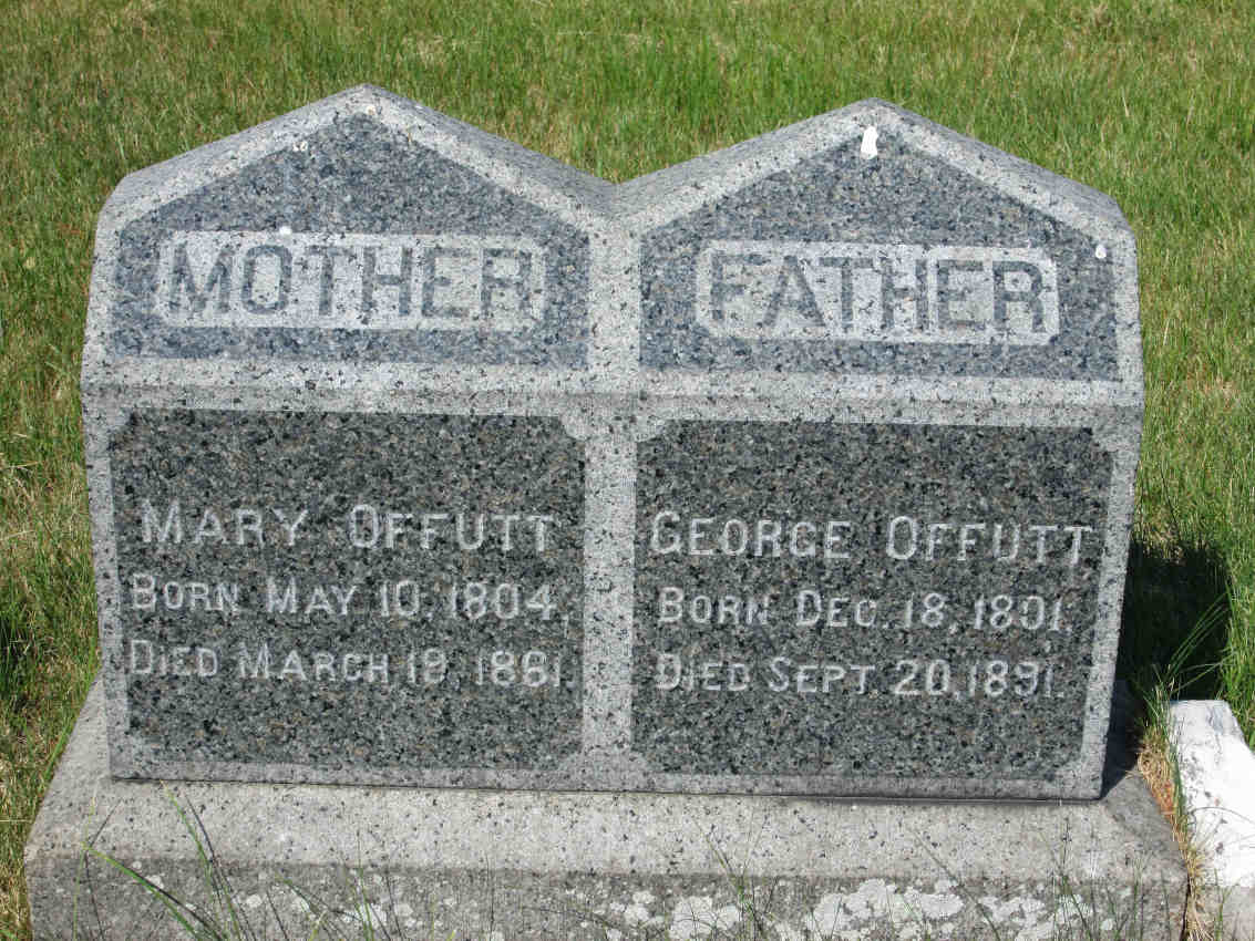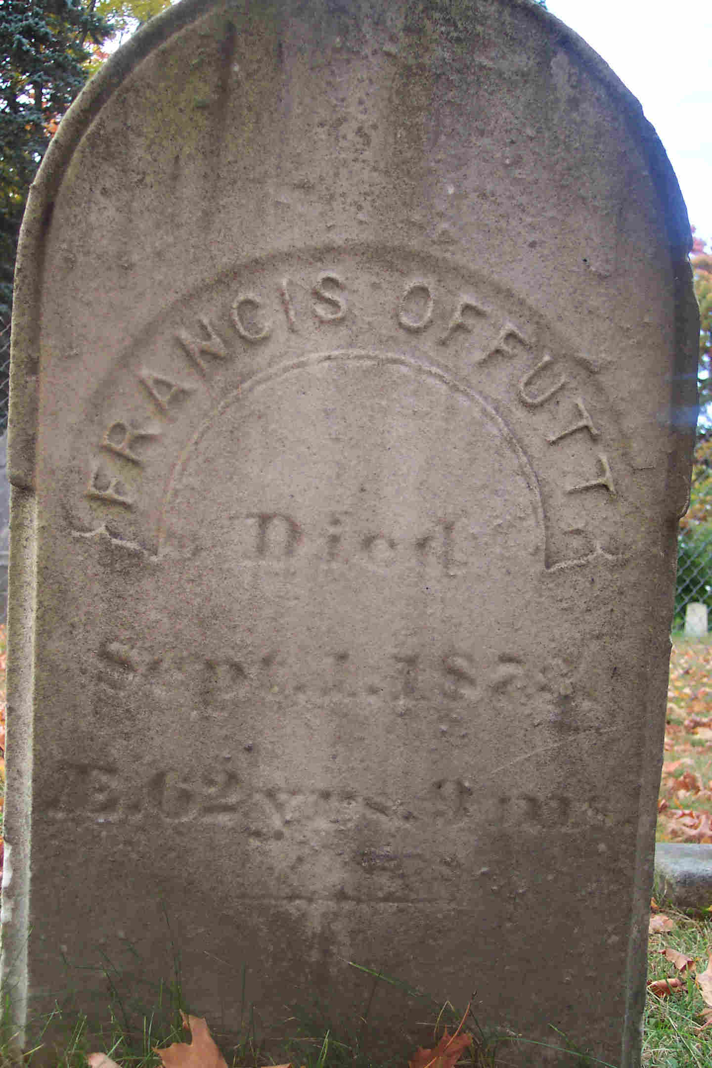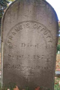 - [S1103] Find A Grave, online http://www.findagrave.com/cgi-bin/fg.cgi, Buried in Plot 448-7. Photo of headstone. Inscription reads Francis Offut; Died September 1, 187? (Appears to be either 1872 or 1873); AE 62 yrs 9 mos.